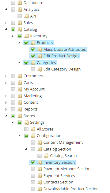 - Sélectionner ensuite les resources accessibles : ici, le dossier Products, Categories, et Inventory Section